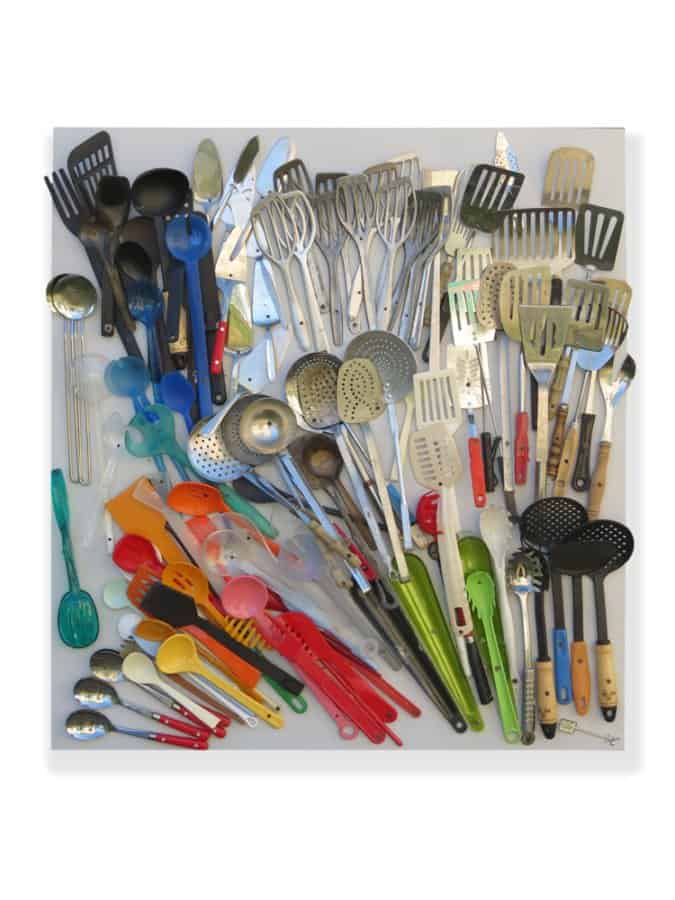 Daniel Spoerri is a Swiss artist famous for his signature “snare-pictures.” These assemblages of objects—most often the remains of a meal, including the plates, silverware and glasses – are fixed to a table or board and displayed on a wall, thereby making the horizontal vertical.