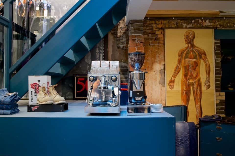 We loved: the vintage & retro décor ambiance of the shop (50s and 60s furniture by Charles and Ray Eames, Saarinen, Friso Kramer), the retro coffee machine (fully operationnal since visitors are offered an espresso upon their visit!), the coolness of the staff, their tatoos, and the beer you get with your purchase.
