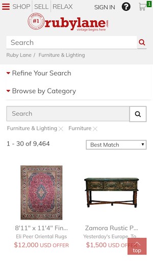 Ruby Lane allows you to easily search for specific keywords or to browse by category and elaborate filter options allow to narrow down your search. If you visit Ruby Lane frequently, you will find it useful to be able to easily browse “Today’s arrivals” or “This week’s arrivals” with one single click.